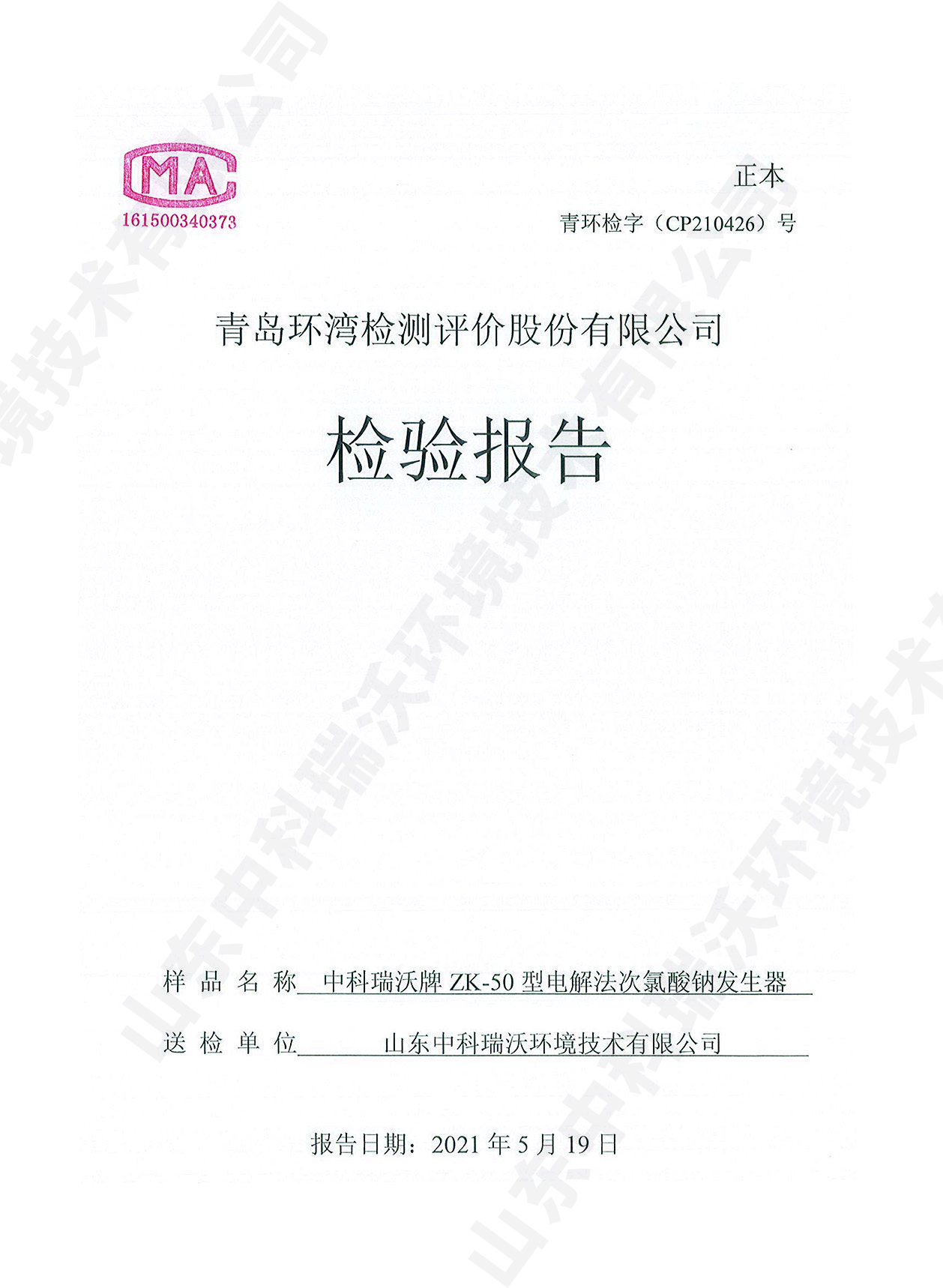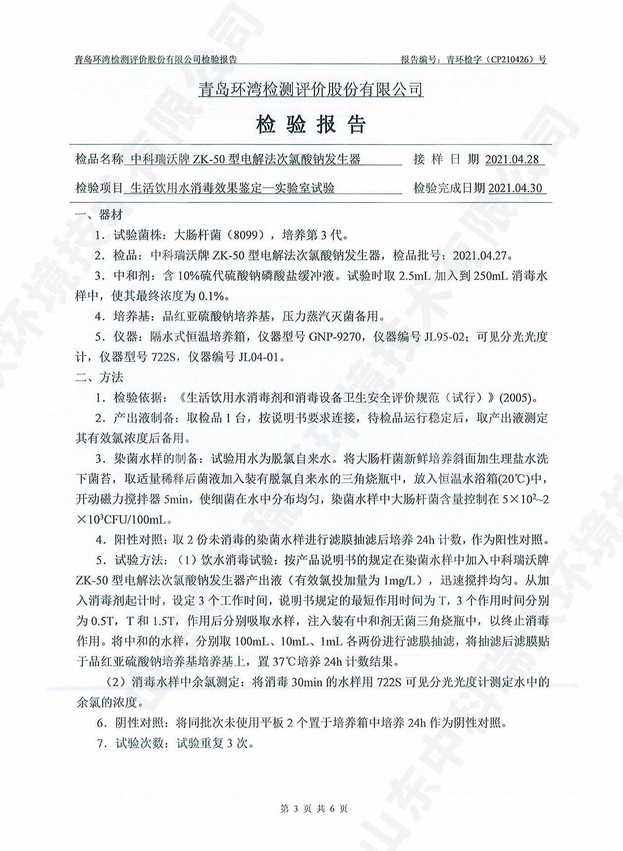 飲水消毒設備檢測報告~二氧化氯消毒